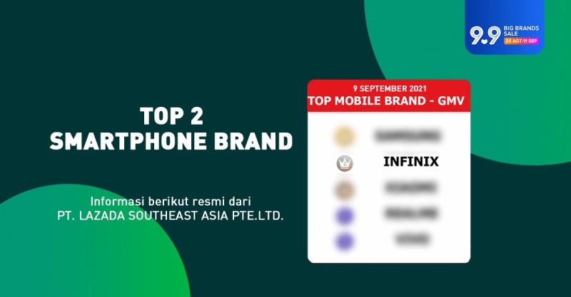 Raihan top 2 di kategori mobile brand dihitung berdasarkan unit dan GMV (gross merchandise value) selama Big Brands Sale 9.9 di Lazada. Ini berarti, Infinix berhasil mengalahkan beberapa brand smartphone lain di gelaran ini.