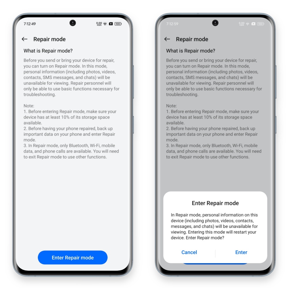 Saat Anda mengklik Repair Mode, Anda akan diarahkan ke halaman berikutnya yang menjelaskan tentang Repair Mode dan instruksi pentingnya. Setelah itu, klik tombol Enter Repair Mode yang akan memunculkan dialog dengan pilihan Cancel dan Enter. Ketika Anda memilih Enter, Anda akan diminta untuk melakukan autentikasi. Setelah diverifikasi, perangkat akan memulai ulang dan masuk ke Repair Mode.