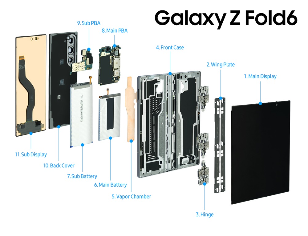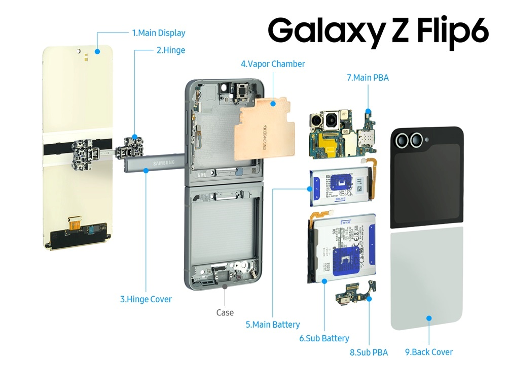 6. PBA Utama dan Tambahan Printed Board Assembly (PBA) utama pada Galaxy Z Flip6 merupakan otak dari ponsel ini, tempat memori dan prosesor berada. Desain bertumpuk dari PBA utama membuat ponsel ini lebih compact dibanding model sebelumnya. PBA tambahan, yang terletak di sekitar terminal pengisian daya dan speaker, mendukung berbagai pita frekuensi radio serta dilengkapi dengan mikrofon MEMS untuk pengenalan suara yang lebih akurat.