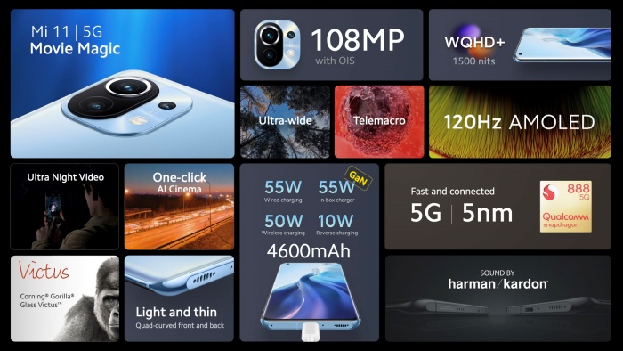 Mi 11 menawarkan konfigurasi kelas flagship, mulai dari generasi terkini chipset Qualcomm® Snapdragon™ 888, kamera utama 108MP yang tersusun dalam sistem triple-camera, dual speaker yang disetel secara khusus oleh harman/kardon, layar dengan resolusi ultra tinggi WQHD+, serta pengisian daya 55W dengan kabel dan 50W nirkabel. Segala performa yang buas ini dikemas dalam desain yang ramping dan ringan menjadikan Mi 11 sebuah produk yang indah sekaligus bertenaga.