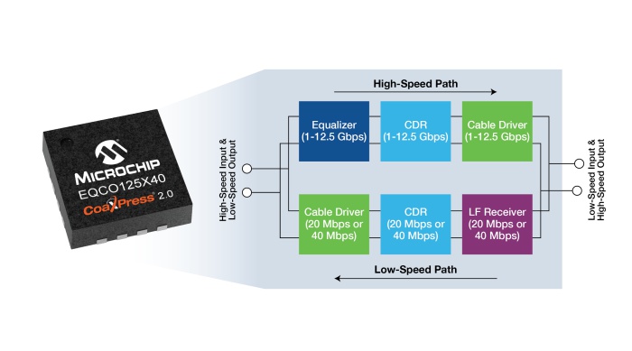 Kelompok alat EQCO125X40 CoaXPress Microchip merupakan yang pertama kali menggunakan standar CXP 2.0, yang dimulai dari desain backward compatible baru berdasarkan spesifikasi, dengan integrasi clock data recovery (CDR) pada semua tingkat kecepatan dan camera-side clock untuk mendukung permintaan dari lingkungan dunia nyata. Alat ini meningkatkan jumlah pemrosesan visi mesin secara signifikan dengan memfasilitasi kamera dan capture cards untuk mengirimkan empat sampai delapan kali lebih cepat daripada solusi alternatif. Selain itu, alat ini memungkinkan empat kali jarak kabel/link dengan tingkat penghematan dan keterlambatan hampir nol.