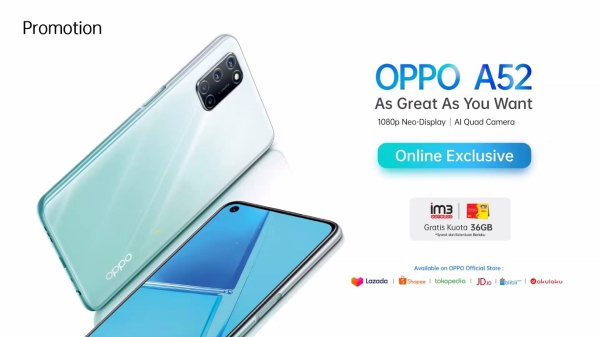 “OPPO A52 adalah perangkat yang khusus kami persiapkan untuk penjualan secara daring. Jika A92 yang akan resmi meluncur pada 8 Mei mendatang merupakan penganti suksesornya A9 2020, maka posisi perangkat A52 hadir untuk mengantikan A5 2020. Perangkat ini hadir dengan keunggulan layar NEO display, AI Quad Camera dan baterai besar 5000 mAh, perangkat ini akan dijual hanya melalui situs e-dagang,” ujar Aryo Meidianto A, PR Manager OPPO Indonesia.