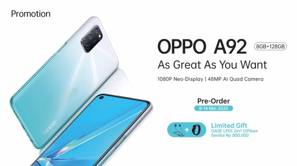 Pemesanan OPPO A92 berakhir tanggal 8 Mei 2020. Pada periode pemesanan, OPPO memberikan bonus preorder berupa Oase Gift Box LP01 yang terdiri dari bluetooth stereo headset dan smart bracelet senilai Rp800.000. Untuk selanjutnya, OPPO A92 yang dijual dengan harga Rp4,199 juta ini, akan tersedia di seluruh jaringan penjualan daring maupun luring.