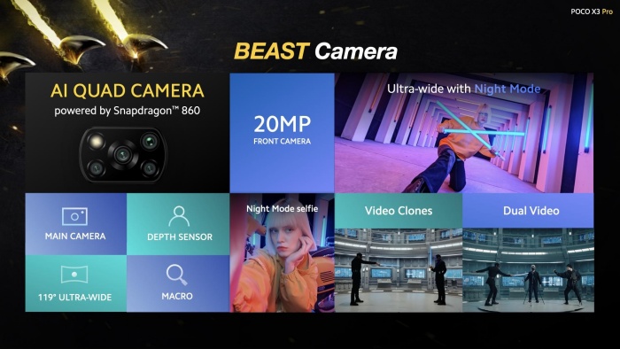 Dari sisi perangkat lunak, kamera POCO X3 Pro memiliki sejumlah fitur yang memudahkan pengguna untuk menciptakan karya yang sulit dilupakan seperti ultra-wide night mode yang bisa menangkap gambar dengan sudut ultra-lebar pada kondisi gelap. Pengguna juga dapat bereksperimen dengan mode video untuk hasil yang unik seperti video clones dan Dual-video untuk merekam dengan kamera depan sekaligus kamera belakang.