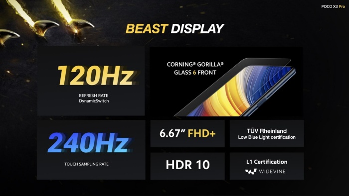 Sertifikasi dari TÜV Rheinland memastikan layar tetap aman bagi mata dari efek negatif sinar biru, begitu pula sertifikasi L1 Widevine menjamin pengguna bisa mengakses pilihan konten definisi tinggi dari layanan streaming seperti Netflix. Dukungan HDR10 menjamin layar POCO X3 Pro untuk bisa menampilkan konten dengan palet warna lebih kaya.