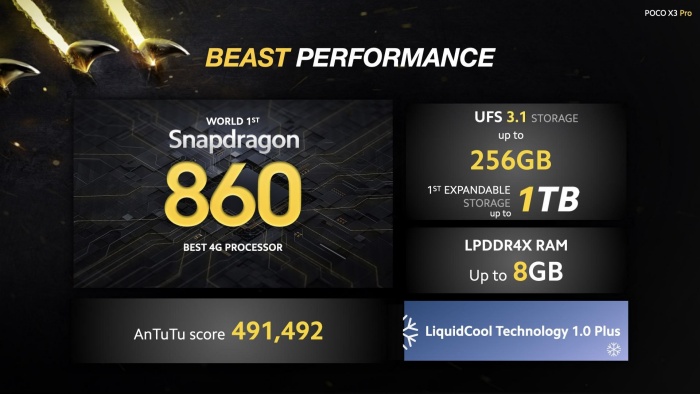 Di dalam POCO X3 Pro, terdapat chipset Qualcomm® Snapdragon™ 860 yang memiliki arsitektur serupa dengan chipset Qualcomm® Snapdragon™ 865 yang digunakan oleh smartphone kelas flagship dengan delapan inti, manufaktur 7 nanometer serta didukung GPU Adreno 640 untuk performa gaming mumpuni. Teknologi LiquidCool Technology 1.0 Plus hadir untuk meredakan panas.